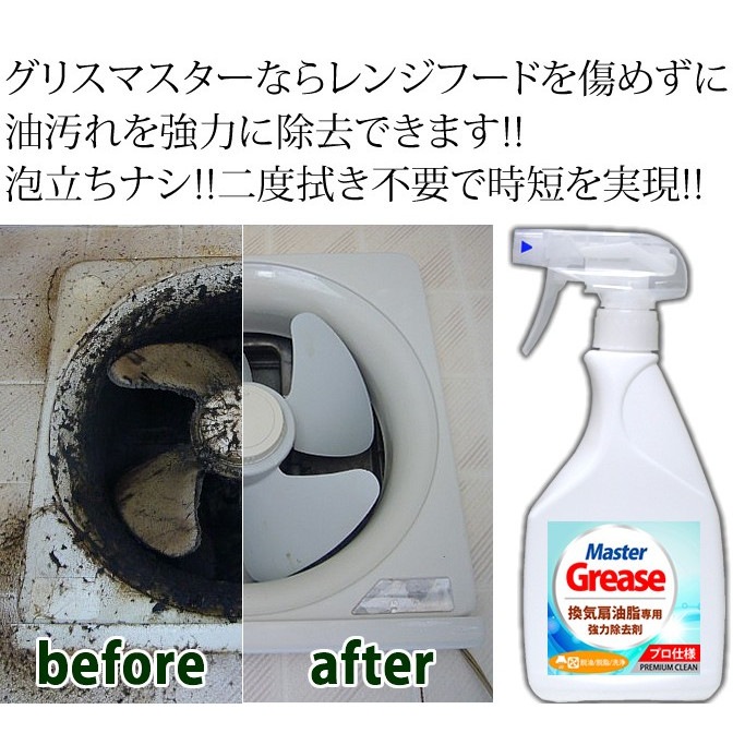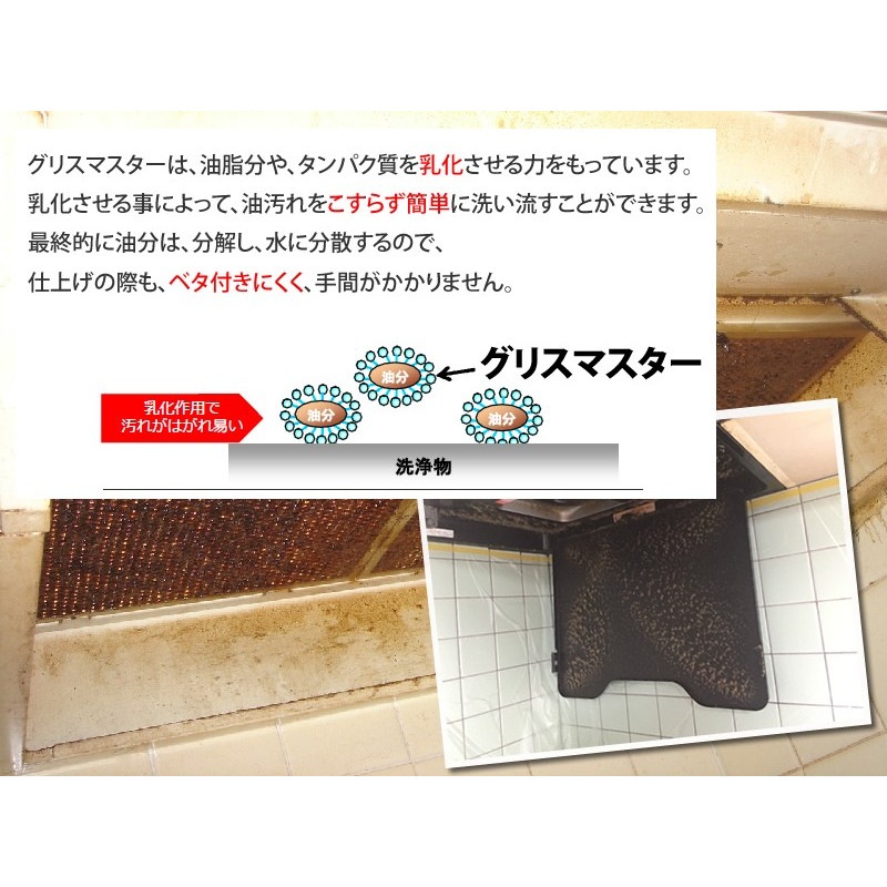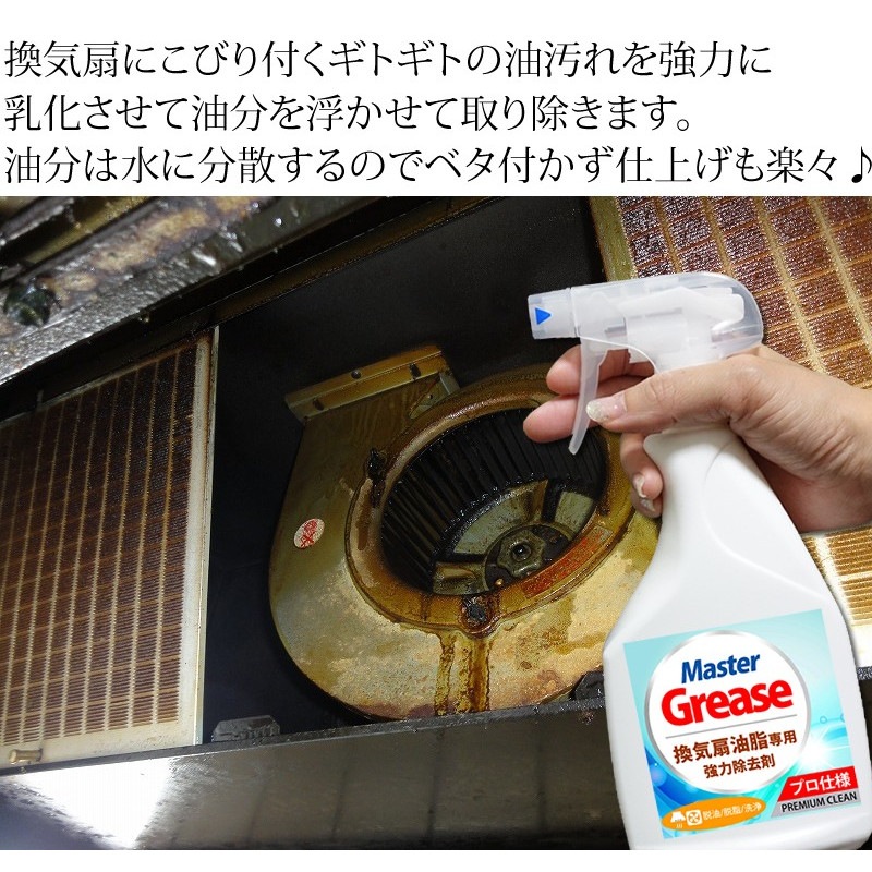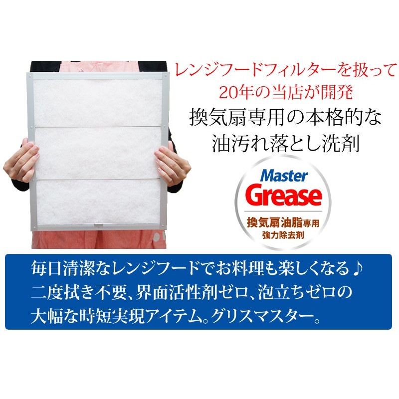 【レンジフードの油汚れ・脱油・脱脂の最高峰/グリスマスター】換気扇のギトギト油汚れやニオイを強力に洗浄・脱脂・消臭するプロ御用達クリーナー(03)